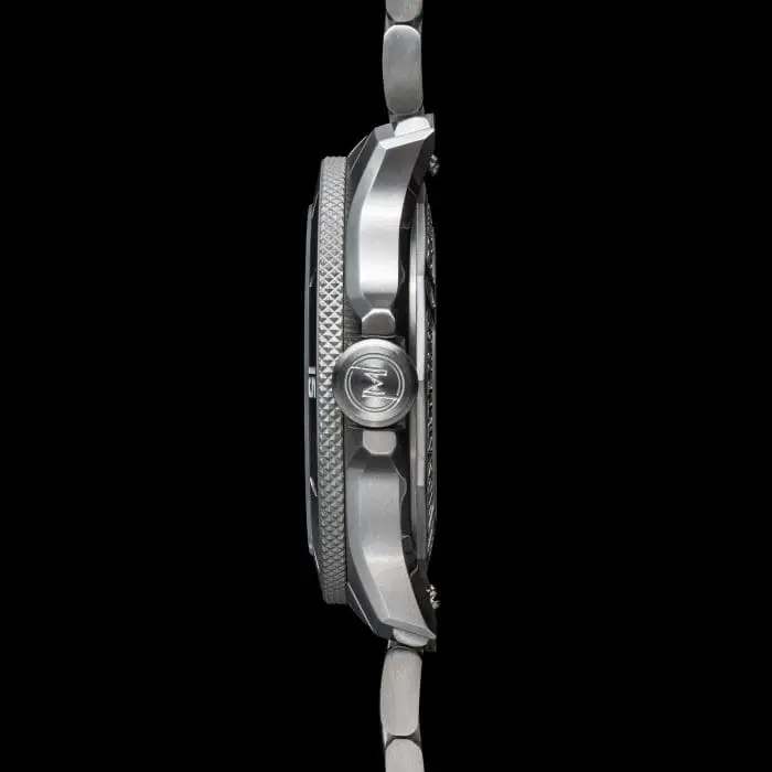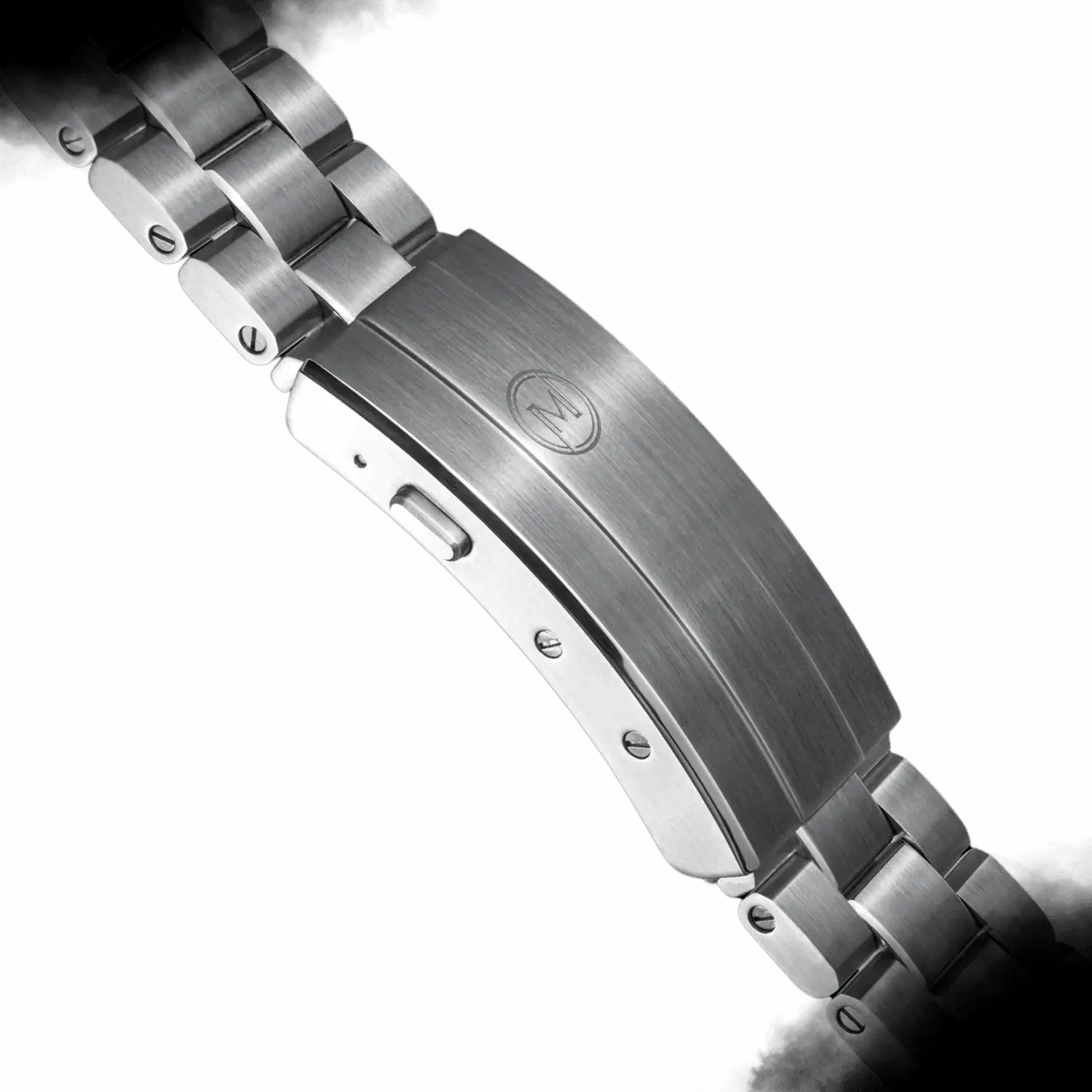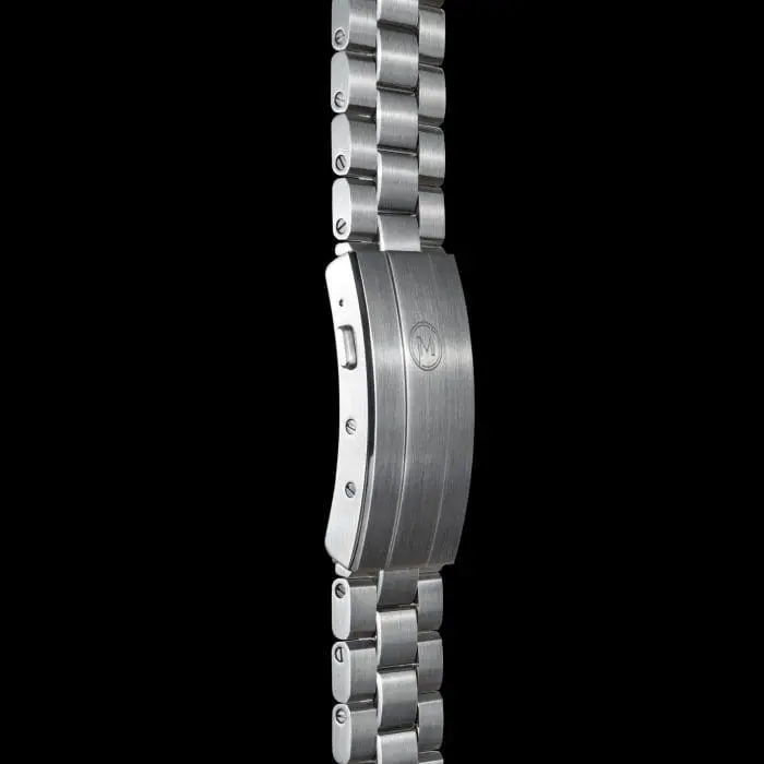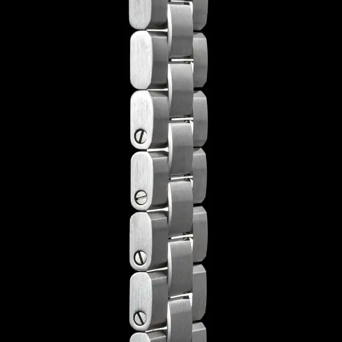 Each link of the bracelet is milled from solid steel, giving it weight and smooth articulation.